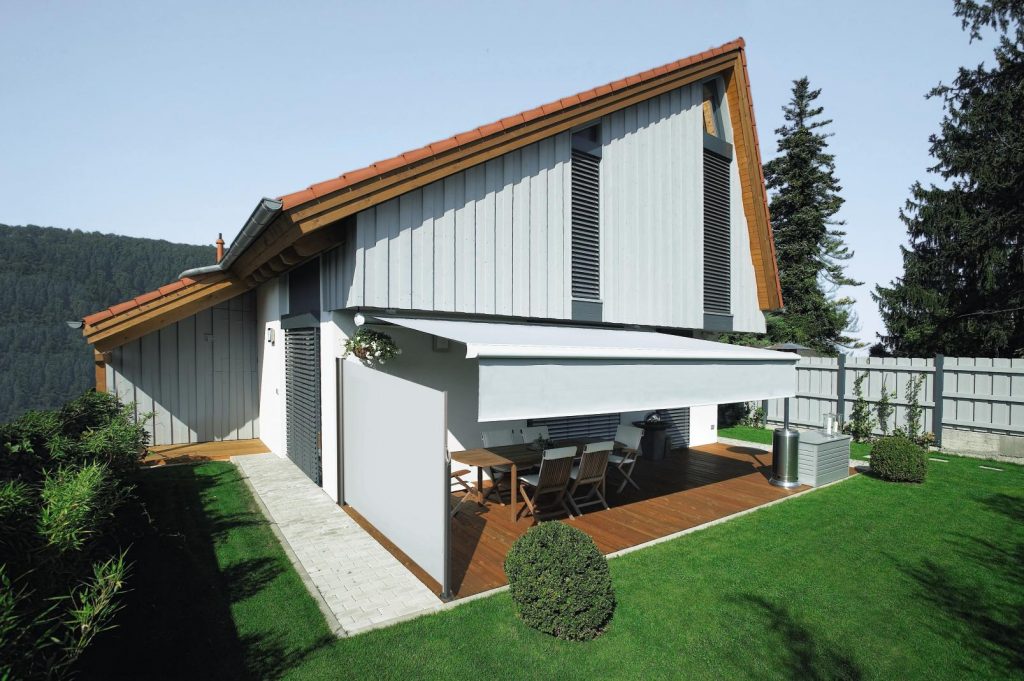 Und jetzt neu – mit schrägem Tuchverlauf passt sich die Seiten-Markise