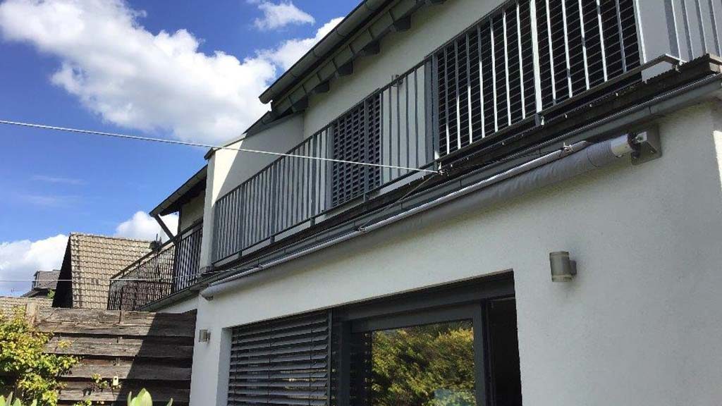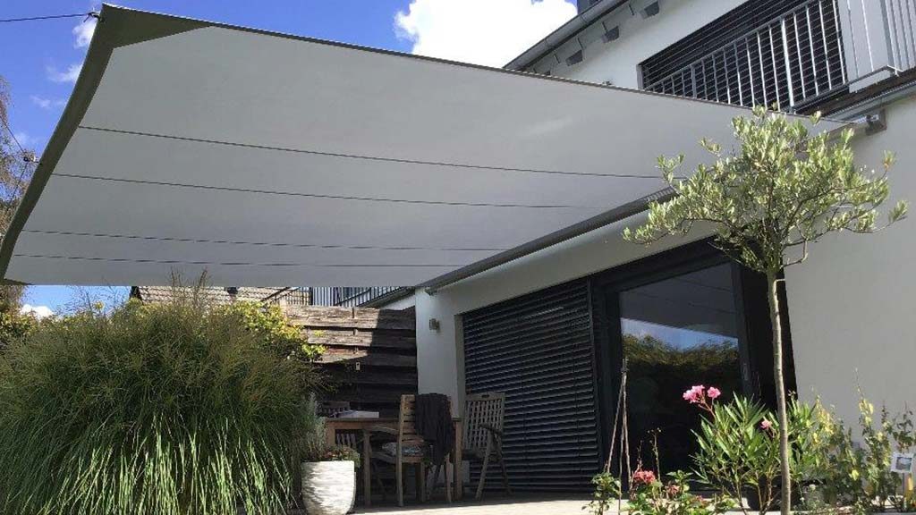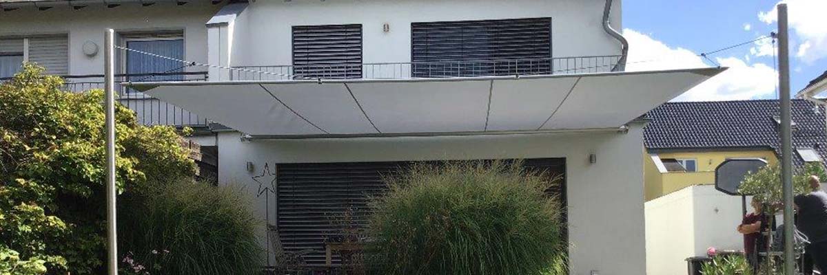 Fläche: ca. 30m² Stoff: Austrosail Nano 2 x Wandbefestigung 2 x Edelstahl-Masten 1 x Höhenverstellung 1 x Winsch